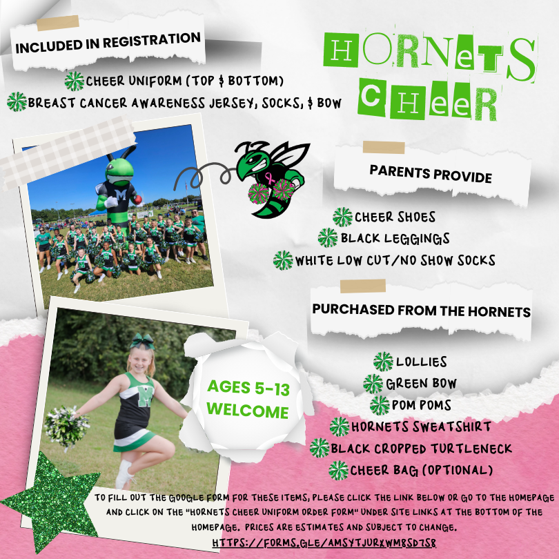 6U (Ages 5 & 6) 8U (Ages 7 & 8) 10U (Ages 9 & 10) 12U (Ages 11-13)Hornets cheer order form:https://forms.gle/amsYTJUrXwm8Sd7s8